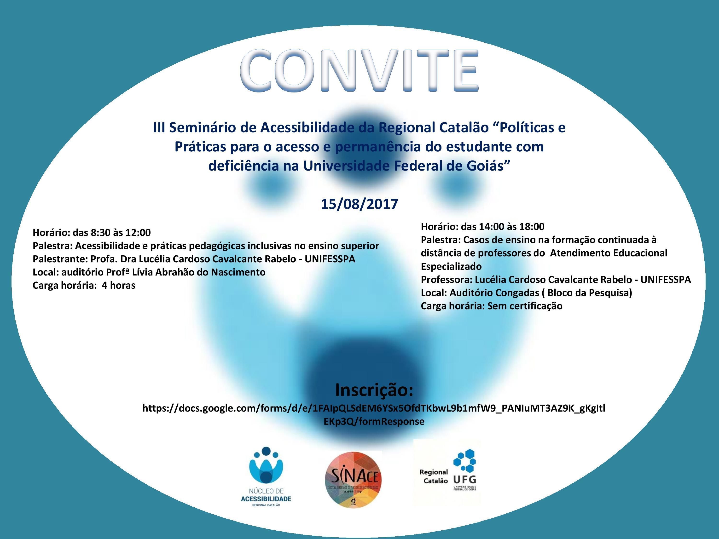 III Seminário de Acessibilidade da Regional Catalão "Políticas e Práticas para o acesso e permanência do estudante com deficiência na Universidade Federal de Goiás".